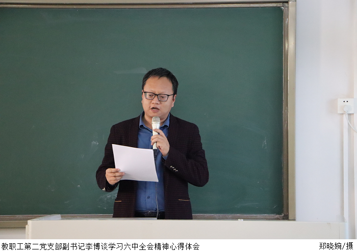 教职工第二党支部副书记李博谈学习六中全会精神心得体会表示,要坚持党的领导,纠正“四风”,在工作中忠诚履职,营造健康向上的育人氛围;坚持与党组织保持高度一致,严格要求自己。