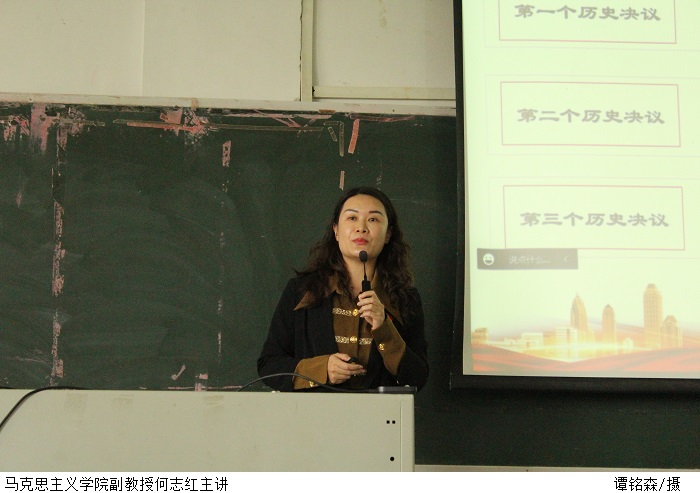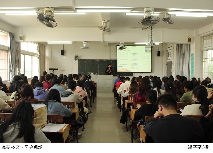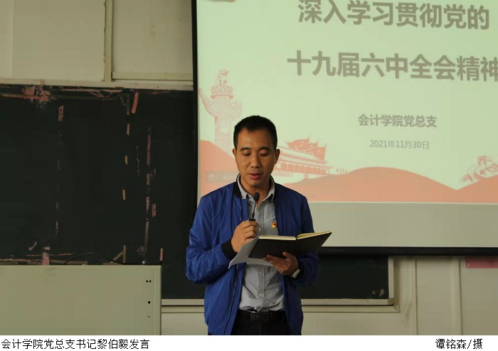 本网讯(会计学院新闻中心 詹思妍)11月30日下午,会计学院党总支在高要校区7312课室召开学习贯彻党的十九届六中全会精神宣讲会,同时在鼎湖校区6110课室同步直播。此次宣讲会由会计学院党总支书记黎伯毅主持,马克思主义学院副教授何志红主讲,会计学院全体教职工及学生代表参会。