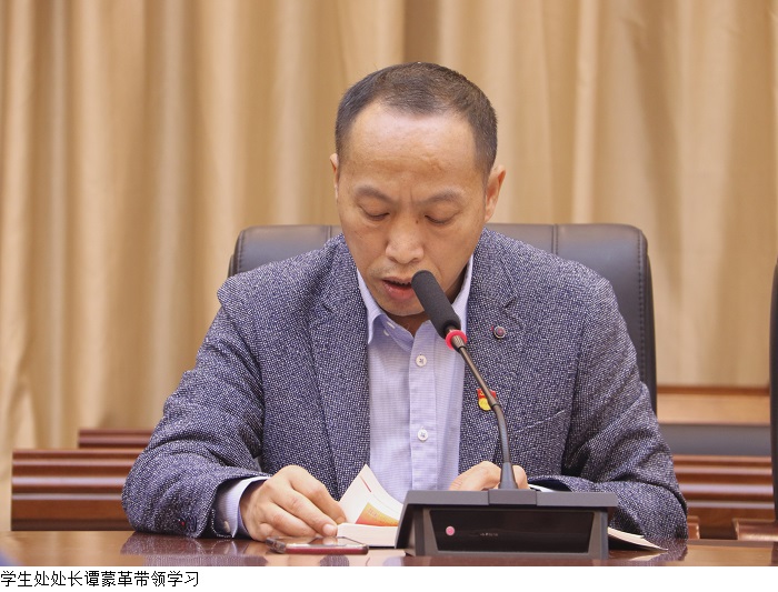 学生处处长谭蒙革带领参会人员学习《习近平新时代中国特色社会主义思想学习问答》原文。谭蒙革强调,党员干部要时刻牢记,不忘初心、牢记使命是共产党员的本质要求,同时要把学习贯彻习近平新时代中国特色社会主义思想作为思想武装的重中之重。