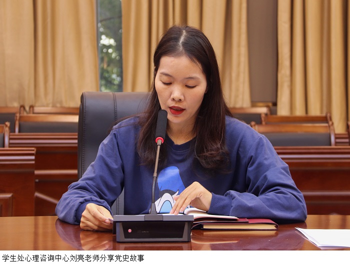 学生处心理咨询中心刘亮老师以“聆听党史故事,传承革命精神”为主题,分享了革命先烈张太雷“寻找我们将来永远的幸福”的故事。刘亮老师表示,张太雷把自己年轻的生命无私奉献给中华民族的解放事业,他的崇高品格和革命精神,永远值得我们学习和怀念。