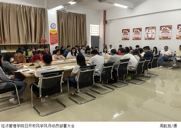 本网讯(经济管理学院)为全面贯彻党的教育方针,响应学校“校风学风建设月”活动号召。10月18日,经济管理学院于党员活动办公室召开动员大会,学院党总支书记甘怀南、党总支副书记吴楚升、全体辅导员参会。