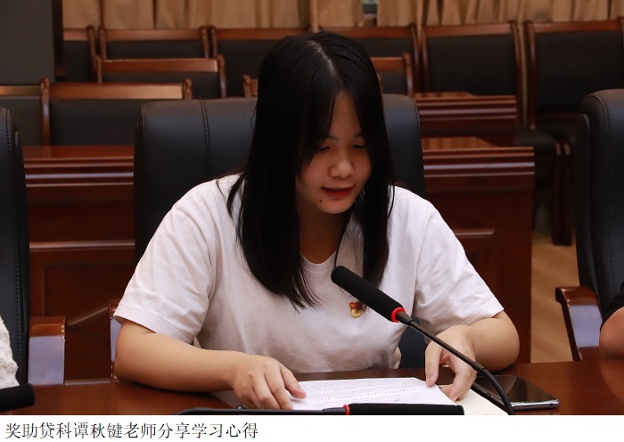 随后,学生处宿舍管理科副科长李晨昊、奖助贷科谭秋键老师结合岗位工作分享了自己的心得体会。李晨昊表示,要将党史学习教育融入立德树人根本任务中,传承红色基因,培养极具坚定理想信念的应用型人才。