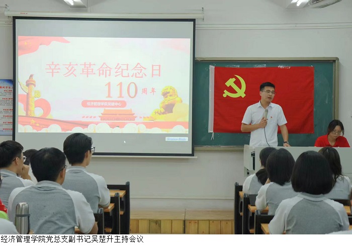 本网讯(经济管理学院)为进一步激发经济管理学院师生的爱国热情,深化其自身的使命担当。10月9日上午,经济管理学院党建中心于5栋203室召开“纪念辛亥革命110周年”专题学习会。会议由经济管理学院党总支副书记吴楚升主持,学生党支部书记赵雪娇、党员发展对象和党建中心工作助理共179人参会。