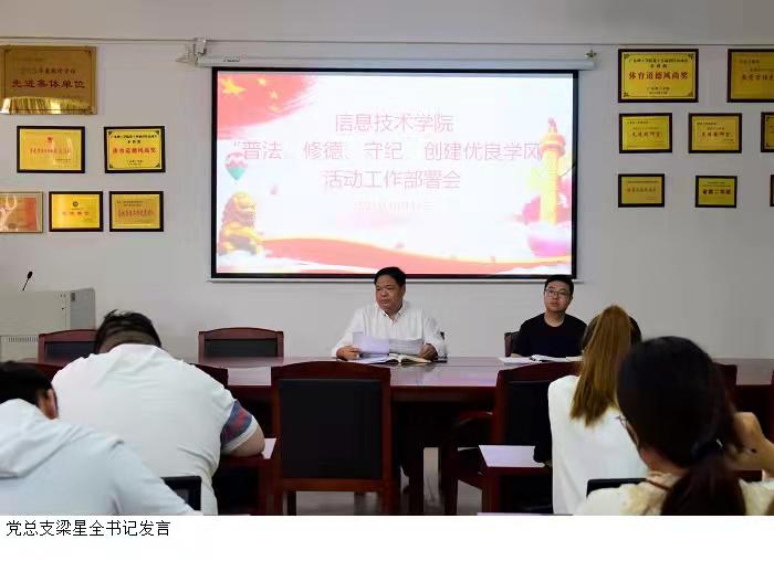 本网讯(信息技术学院 黄欣妍)为扎实开展“普法、修德、守纪、创建优良学风”活动,坚持和落实“依法治校,以德治校”工作,信息技术学院于10月14日在振华楼203室召开“普法、修德、守纪、创建优良学风”活动工作部署会。党总支梁星全书记、冷云峰副书记以及全体辅导员参加会议。