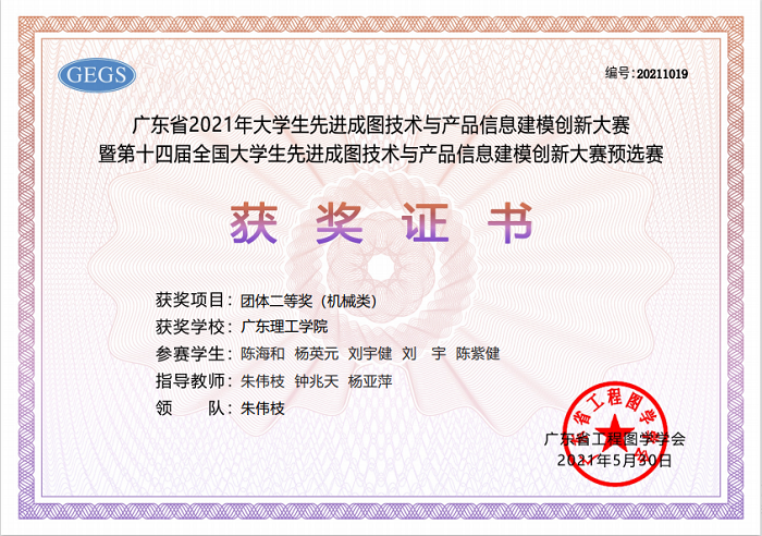 伟德官网学生连续参加了3届成图大赛,每次大赛都取得了好成绩。本次成图大赛系部领导高度重视,指导开展各项工作,并积极为学生协调培训训练场所。以陈海和、刘宇、杨英元为代表的9位学生组成的代表队,在钟兆天、朱伟枝、杨亚萍三位老师的指导和带领下,不畏强手,敢于拼搏,敢于亮剑,经与华南理工大学、广东工业大学、深圳大学等诸多高校选手同台竞技、激烈角逐,最终取得优异成绩。陈海和,杨英元,刘宇健,刘宇,陈紫健获得机械类团体二等奖及均获个人全能二等奖,郑奥林,陈国颖,郑忆萍获个人全能三等奖,朱伟枝,钟兆天,杨亚萍三位老师获优秀指导教师。