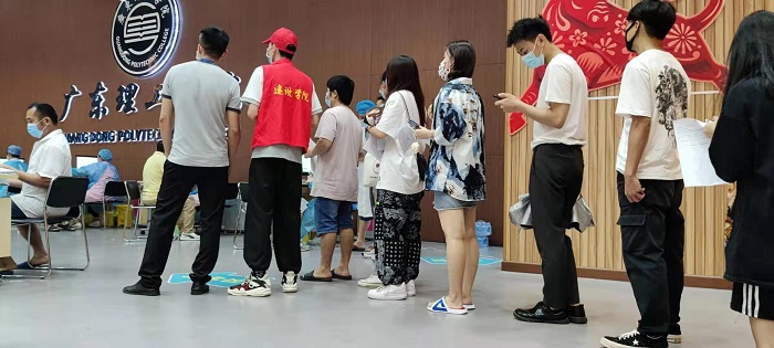 在34℃高温下,建设学院志愿者服务在一线,协助医护人员做好预约登记、扫码测温、信息登记、接种指引、维护现场秩序等工作,他们严谨、认真、负责的工作态度受到师生赞誉。