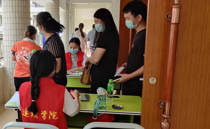 6月9日一早,在鼎湖校区6栋礼堂,建设学院的志愿者在新冠疫苗接种人群还未到时,已经摆好了桌椅电脑,随时等待接种工作开始。