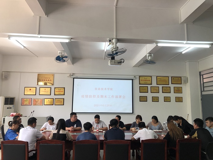 本网讯(信息技术学院 黄佳欣)为抓好常态化疫情防控,确保期末教学工作有序开展。6月21日,信息技术学院于振华楼203室开展疫情防控及期末工作部署会。党总支梁星全书记、冷云峰副书记及全体辅导员老师参加。
