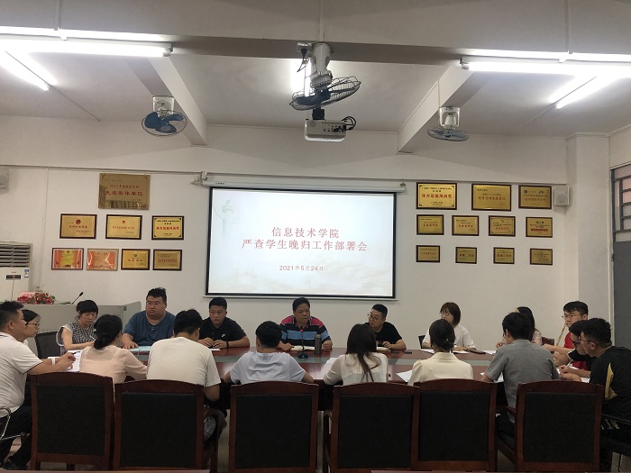 本网讯(信息技术学院 林淑卿)为加强学生宿舍管理,强化校园安全教育。5月24日,信息技术学院开展严查学生晚归工作部署会,信息技术学院梁星全书记、冷云峰副书记以及全体辅导员参加会议。