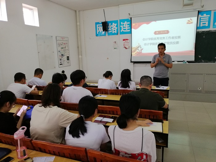 本次讨论会围绕着会计学院刘奕彤的入党申请事宜,投票选举会计学院优秀党务工作者、优秀共产党员和会计学院教职工党支部组织委员展开。
