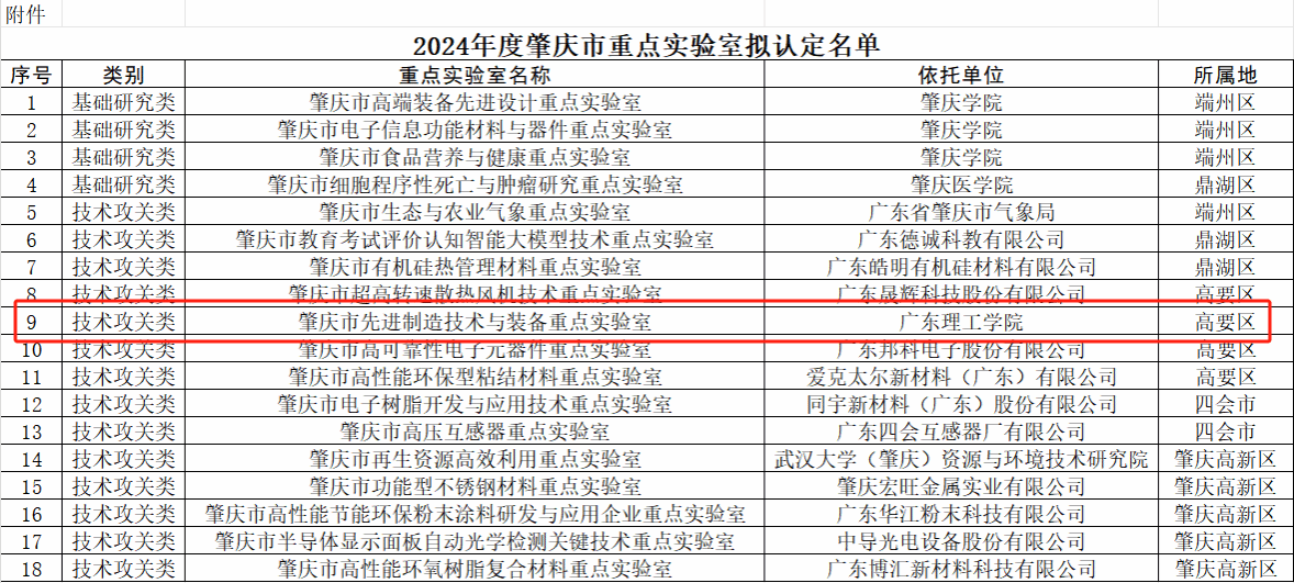 本网讯(科技处 许昊)近日,肇庆市科学技术局公布了《肇庆市科学技术局关于认定2024年度肇庆市重点实验室的通知》,根据《肇庆市重点实验室管理办法》(肇科〔2024〕14号)和《关于组织申报2024年度肇庆市重点实验室的通知》要求,经发布通知、形式审查、现场核查、专家评审及公示等程序,同意认定“肇庆市高端装备先进设计重点实验室”等18家实验室为2024年度肇庆市重点实验室,其中伟德官网智能制造学院申报的“肇庆市先进制造技术与装备重点实验室”成功认定为2024年度肇庆市重点实验室。