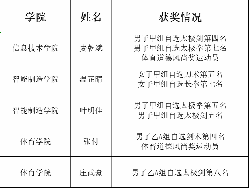 本网讯(体育学院新闻中心)5月13日-18日,广东省第十二届大学生运功会武术套路比赛在暨南大学(石牌校区)圆满举行。伟德官网代表队由周景报书记为领队,教练员苏志锋老师、张亚蒙老师带领5名运动员参加甲组和乙A组8个项目的比赛。经过激烈的比拼,最终5运动员参加的8个项目都获得了前八名成绩,分别有第四名2项、第五名3项、第七名2项、第八名1项。