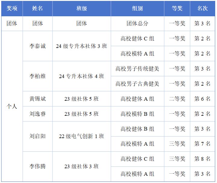优异成绩的背后,离不开运动员的刻苦训练、教练员的科学指导以及学校的全力支持。备赛期间,教练团队根据每位运动员的身体特点、竞技水平和项目需求,量身定制训练方案,精准优化肌肉线条和舞台表现力。同时,团队严格执行科学的饮食管理计划,从热量摄入到营养配比,再到食材选择,均经过精细计算,确保运动员以最佳状态参赛。