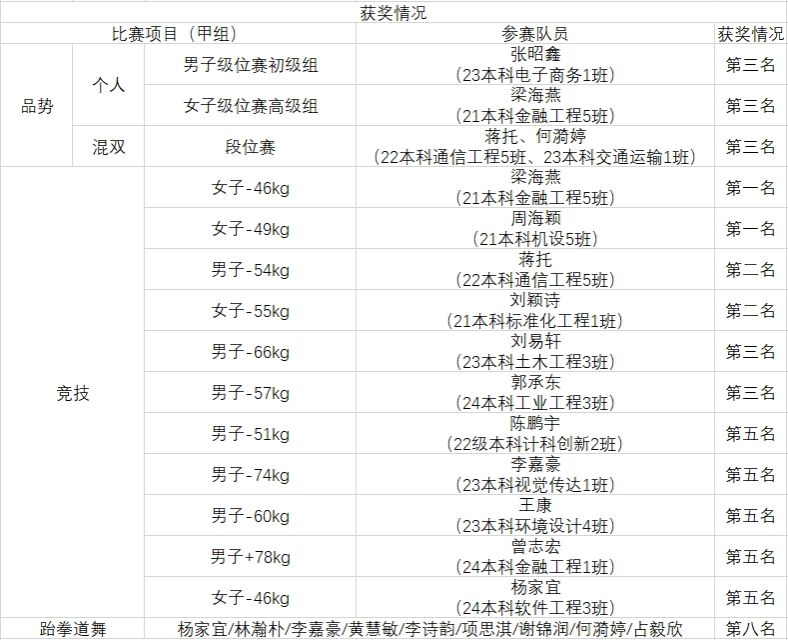 本次赛事设甲组、乙A组、乙B组和丙组四个组别,竞争异常激烈。伟德官网派出32名运动员参赛,在体育学院书记夏磊、副书记李江华的带领下,教练团队周尤、彭志刚、饶赛凤与队员们团结协作,迎难而上。甲组竞技团体总分位列全省第二,仅次于承办方中山大学;甲组品势团体荣获二等奖;乙A组更以6人精锐阵容斩获2金1银2铜,品势团体总分第四名,强势摘得一等奖。
