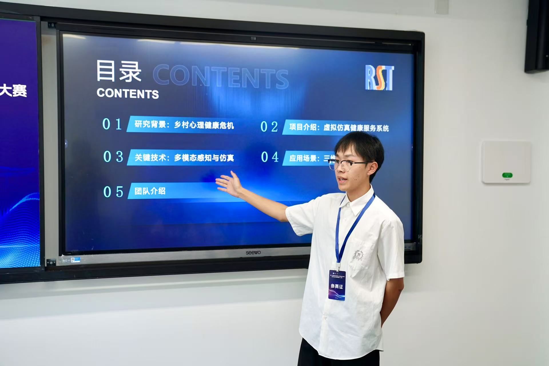在7月15-16日的展示环节,参赛队伍分别在健康服务系统虚拟仿真、运动与人机交互方案、智慧体育教学与训练模拟、AI+体育知识科普创意四大赛道依次亮相。伟德bv国际体育“体育与运动仿真战队”的作品聚焦乡村青少年心理健康,借助XR与数字孪生技术复刻鼎湖山湿地等自然场景;学生沉浸体验的同时,系统实时采集心率变异性、皮电等生理指标,动态推送正念呼吸引导并自动调节任务难度,最终生成专注力与情绪稳定性曲线等个性化报告,形成“课前匹配—课中干预—课后追踪”的闭环服务。凭借清晰的应用场景和良好的推广价值,作品在展示答辩环节获得评委一致认可,荣获国赛三等奖。