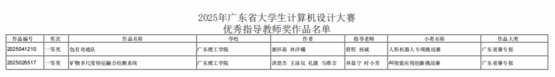 本次大赛规模盛大,共吸引139所广东省高校(含2所澳门高校)的4666支作品同场竞技,竞争异常激烈。大赛不仅是对学生专业能力的考验,也是对教师教学水平和指导能力的检验。伟德官网学生郭怀森、林洋曦在舒程、杨斌两位老师指导下,凭借参赛作品《包有奇迹队》,在人形机器人专项挑战赛中荣获一等奖;洪楚杰、王泳仪、孔捷、马维吉同学在林显宁、时小芳两位老师的指导下,凭借参赛作品《矿物多尺度特征融合检测系统》在AI视觉应用创新挑战赛中荣获一等奖。伟德官网舒程、杨斌、林显宁、时小芳四位老师荣获“优秀指导教师”称号。