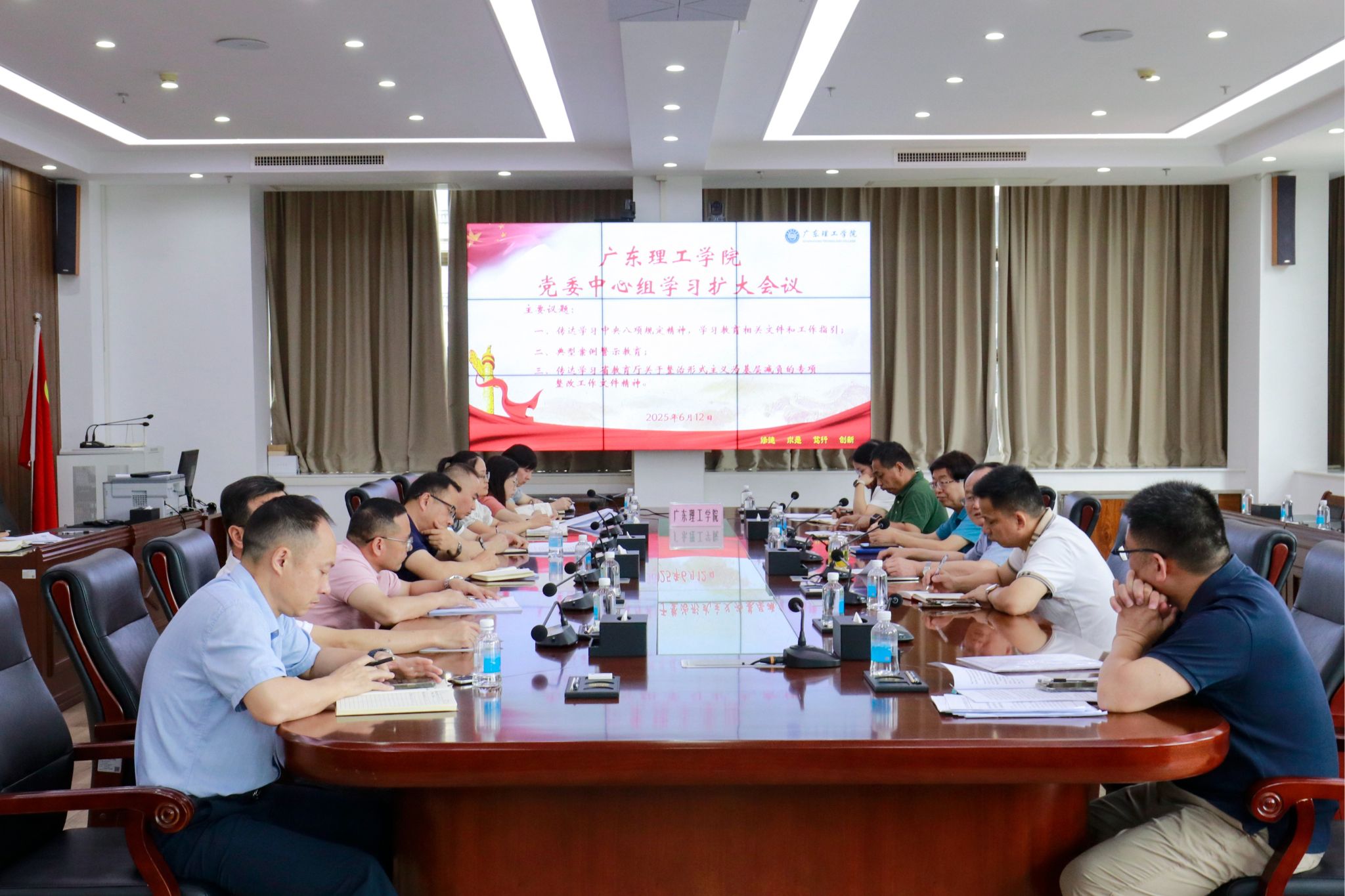 本网讯(党委宣传部)6月12日上午,学校党委理论学习中心组扩大会在高要校区综合楼12楼会议室召开。校长陈晓阳主持会议,校党委书记胡海建等全体在校党委委员、纪委委员,党政职能部门负责人,各二级学院党委正副书记、直属党支部书记,马克思主义学院院长、通识教育中心主任等参加了本次专题学习。深化学习强根基,精准施策抓落实党委组织部部长廖振宇深入传达中央八项规定精神核心要义,领学最新教育领域相关文件与工作指引。...
