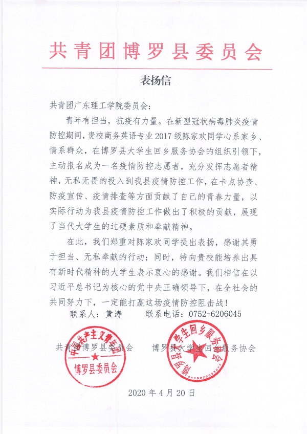 本网讯(校团委)疫情当前,青年勇当先,伟德官网广大学子响应号召,积极参加疫情防控志愿服务工作,用实际行动弘扬抗击疫情正能量,充分发挥了当代青年学生的使命与担当。 截至目前,伟德官网共收到近30封来自全国各地的表扬...
