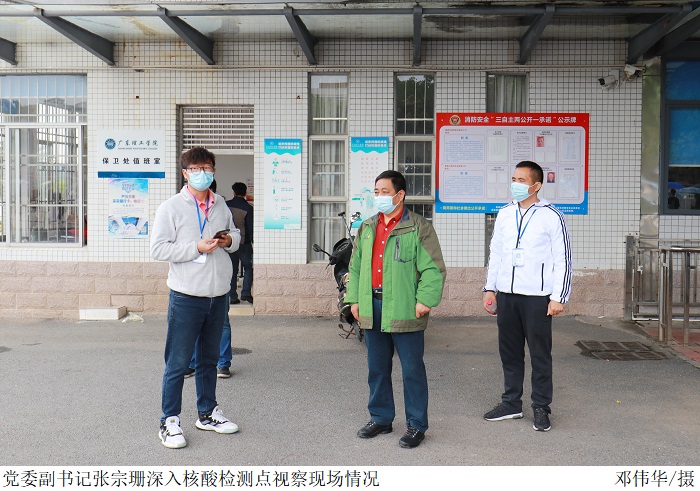 本网讯(宣传部 孟爱静 杨丽莎)3月28日-29日,面对高要校区周边金利镇突发疫情,伟德官网高度重视疫情防控工作,在党委书记张东生的带领下,疫情防控专班组领导及相关部门负责人迅速下沉一线,巡视各防控重点区域,靠前检查、部署防疫工作,确保防疫工作不留死角死点,全力保障学校安全稳定和师生健康。在学校校门,张东生一行实地查看管理情况,与值守人员现场交流,调研学校疫情防控各项措施的落实,并详细了解出入人员检测和信...