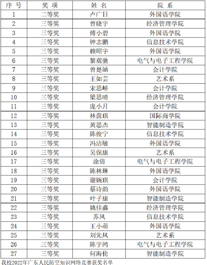 本网讯(保卫处 王翼飞)近日,由广东省教育厅、广东省人民防空办公室、广东省全民国防教育中心与南方+等四家单位共同组织举办的“2022年广东人民防空知识网络竞赛”在广东国防公众号上公布竞赛结果。伟德官网成绩突出,荣获“优秀组织奖”,总积分排名全省第12名;曾荫初、王翼飞2位老师获“优秀指导老师”,卢广日同学获二等奖,曾晓宇等26位同学获三等奖。为推动人民防空知识宣传教育全面展开,伟德官网以人人参与为目标,由保卫处第...